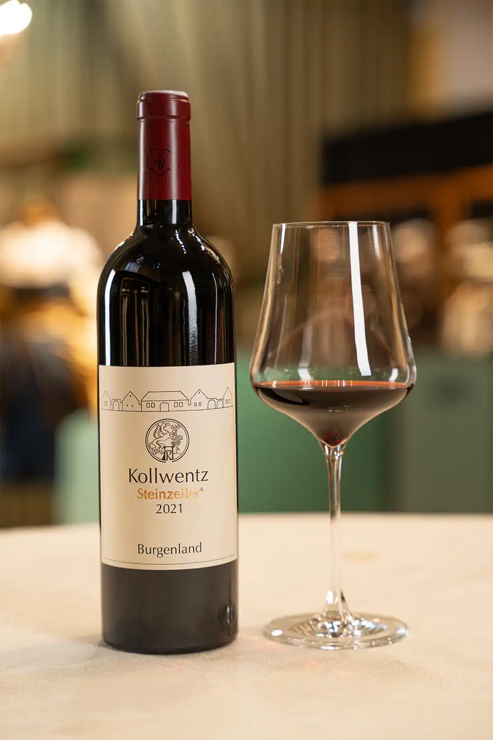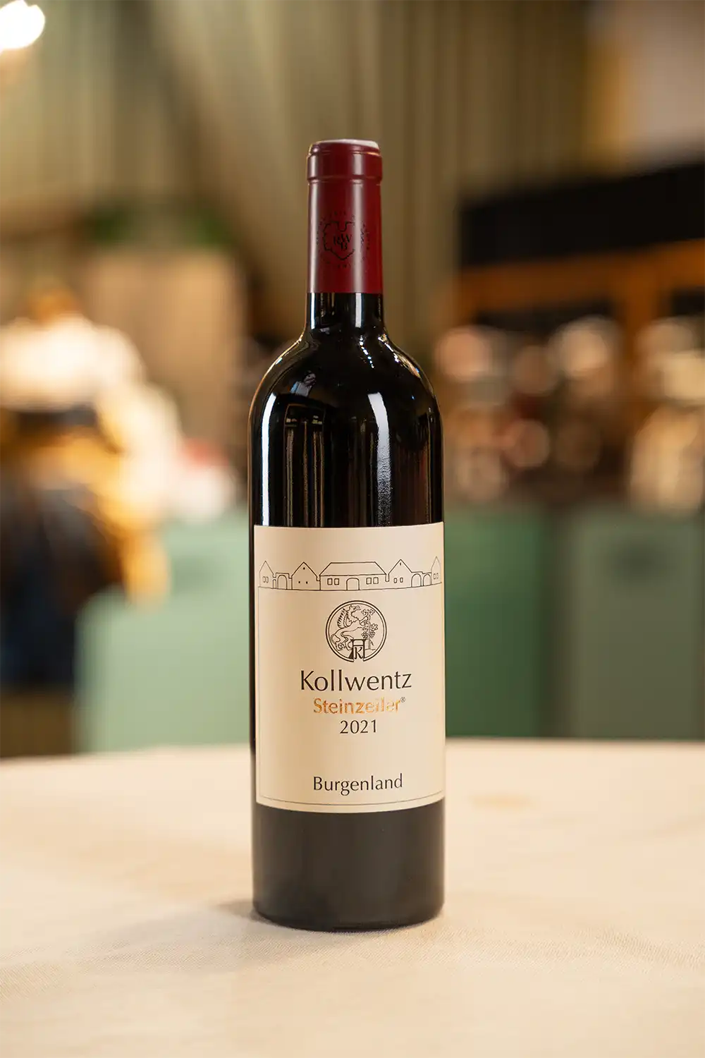Der Steinzeiler, kraftvoller und eleganter Rotwein aus Blaufränkisch, Cabernet Sauvignon und Zweigelt – ideal zu Wild, Fleisch und Käse.